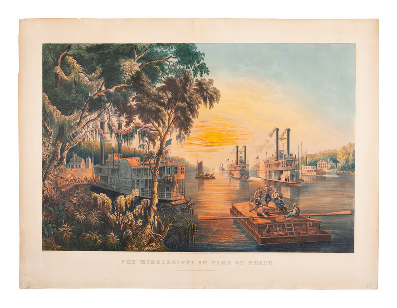 The Mississippi in the Time of Peace, 1865. (G. 4519). Large format lithograph with hand-coloring heightened in gum arabic, on wove paper, 605 x 809 mm sheet. A few small surface scratches or abrasions affecting image and title, Some minor mostly marginal spotting or toning, staining verso from old framing, old pencil annotations lower margin.