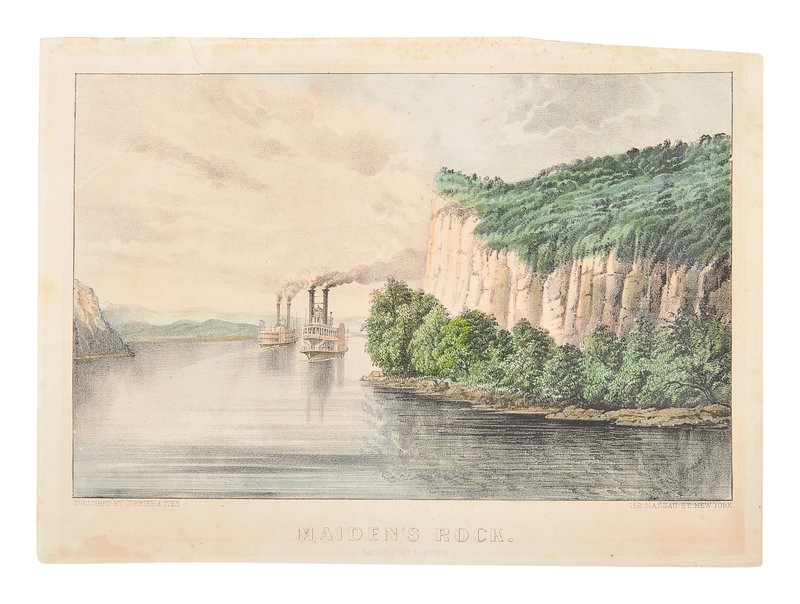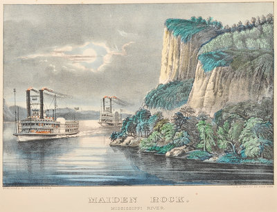 Maiden's Rock. Mississippi River, n.d. (G. 4216). -- Maiden's Rock. Mississippi River, n.d. (G. 4217) -- 3 small-format lithographs with hand-coloring heightened in gum arabic on wove paper, 298 x 398 mm sheet or smaller, matted and framed, some minor toning or mat burn, the day view with 4 1/2-in. tear crossing upper left corner repaired verso and some spotting.