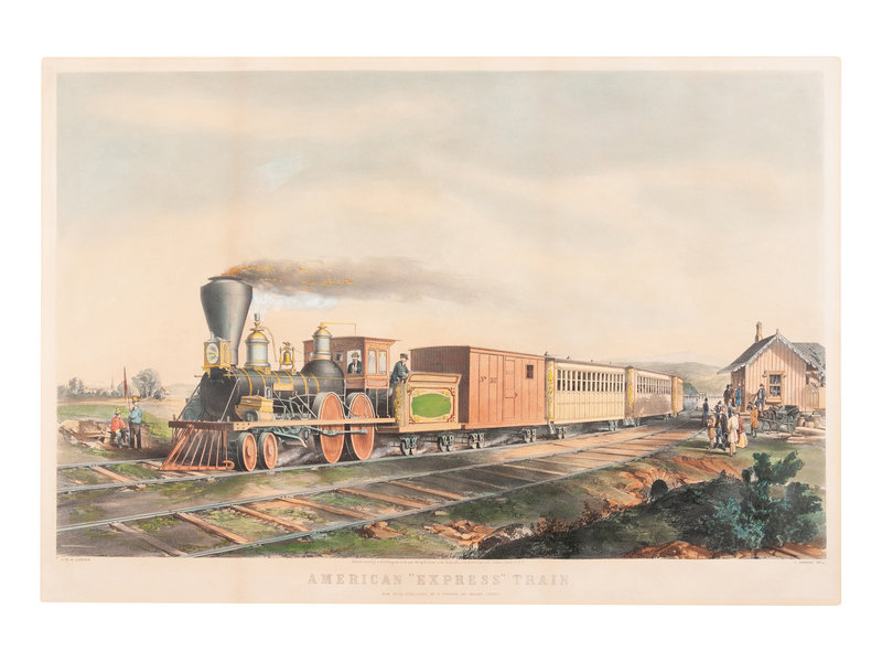 American “Express” Train, 1855. (G. 0142). Large format lithograph with hand-coloring heightened in gum arabic, on wove paper, matted and framed, 510 x 734 mm sheet. 1-in. tear to upper margin repaired, toning from old matting, browning from old framing verso, discreet dealer pencil annotations verso. Provenance: Mrs. Kelley (old pencil note verso regarding framing). VERY RARE: According to online records, no example of this print has sold at auction since 1929.