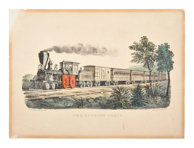 The Express Train, n.d. (G. 1946). Small format lithograph with hand-coloring, heightened in gum arabic, on wove paper, matted and framed, 256 x 360 mm sheet. Slight rippling to the sheet, some minor mostly marginal mat burn, very slight chipping to lower left edge, some minor soiling verso from old framing, a few small pencil annotations verso. The version of this print with no stock number (see previous lot).