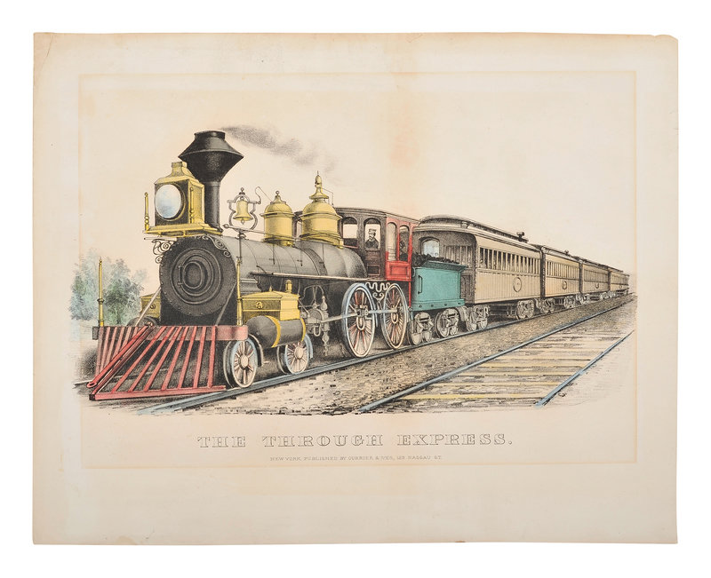The Through Express, n.d. (G. 6525). Small format lithograph with hand coloring, on wove paper, matted and framed, 305 x 382 mm sheet. Marginal mat burn, blank area of upper left corner repaired, browning from old framing verso. Provenance: Victor [Knight] (7-line inscription verso).