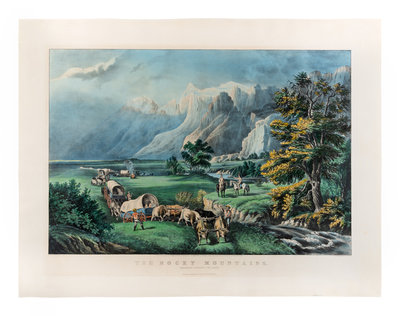 The Rocky Mountains. Emigrants Crossing the Plains, 1866. (G. 5633). Large format lithograph with hand-coloring heightened in gum arabic, printed on very thick wove paper, matted and framed, 600 x 783 mm sheet. Minor toning from matting, a few very minor spots not affecting image, otherwise very bright, discreet dealer pencil annotation recto. VERY RARE: According to online records, only one example of this print has sold at auction in the last 60 years.