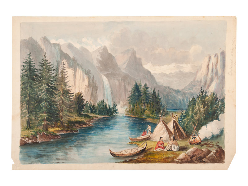[Yosemite Valley -- California. "The Bridal Veil" Fall]. Original watercolor study on paper. 485 x 720 mm sheet. Slight rippling to the sheet, a few pinholes in the corners, a few short marginal tears, small losses to blank areas of lower corners.
