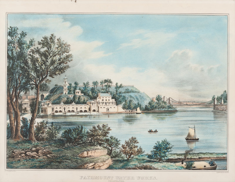 Fairmount Water Works. Philadelphia, n.d. (G. 1964). Medium-format lithograph with hand-coloring heightened in gum arabic, on wove paper, matted and framed, unexamined out of frame, 323 x 417 mm sight. A few minor surface abrasions in the upper margin.