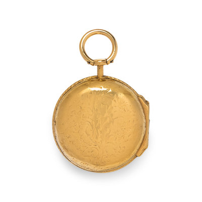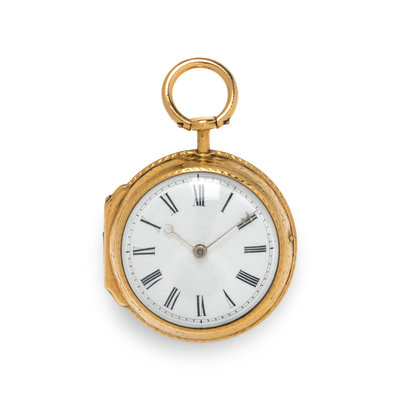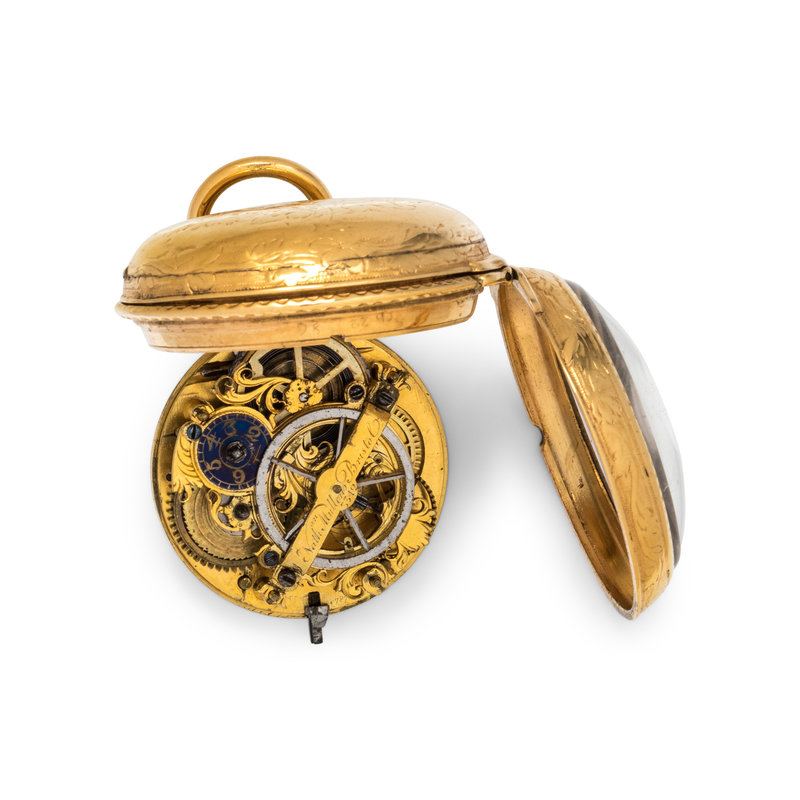 45.00 mm case diameter, white dial, black Arabic numerals, key wound and set gilt verge fusee movement signed NATHAN MULLENS BRISTOL, foliate engraved case back.
