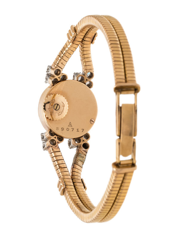16.00 mm case diameter, the lugs containing 12 round brilliant cut diamonds, matte silvered dial, applied gold Arabic and dagger numerals, manual wind movement, two strand square tubogas bracelet, fold over clasp. 6-6 1/4 inches long.