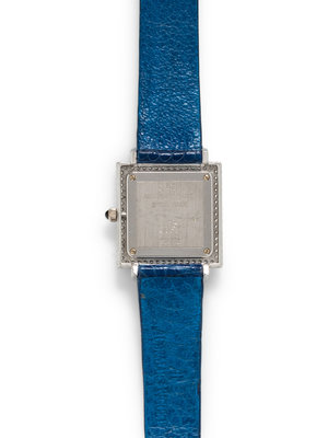 25.00 x 25.00 mm case dimensions, the bezel and lugs containing 32 calibre cut sapphires, 60 round brilliant cut diamonds and 20 square step cut sapphires, blue guilloche dial, Arabic and diamond numerals, quartz movement, blue leather strap signed AUDEMARS PIGUET, white gold tang buckle. 6 1/2-7 3/4 inches long.
