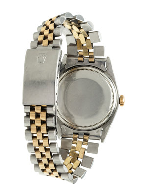 35.00 mm case diameter, matte gold dial, center sweep seconds, date aperture at 3 o'clock with magnifier in crystal, self-winding movement, steel and gold Jubilee link bracelet, deployant clasp. 7 1/2 inches inner circumference.