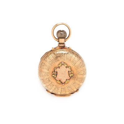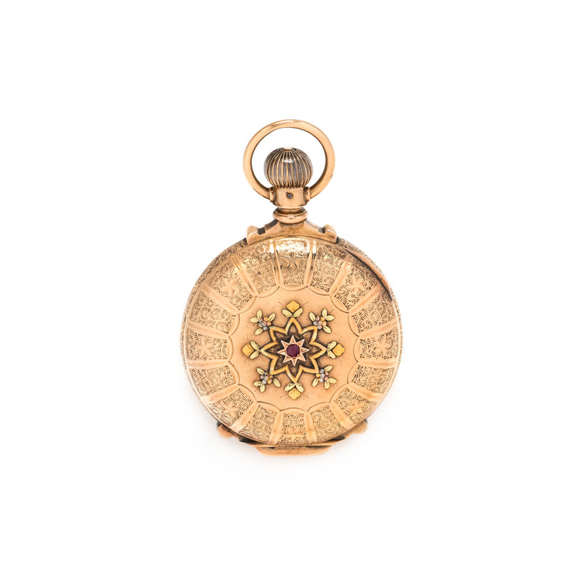 52.00 mm case diameter, white dial, black Roman numerals, subdial for seconds at 6 o'clock, stem wound lever set nickel movement signed GEO. R. CALHOUN & Co NASHVILLE, TENN., foliate engraved case with monogram engraved cartouche with yellow and white gold floral details, the case back containing one synthetic ruby.