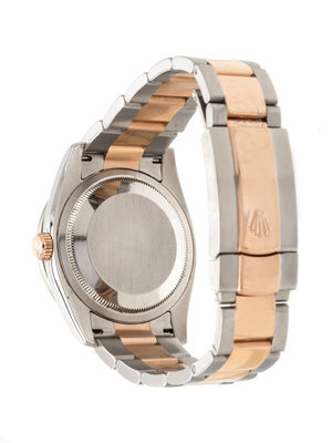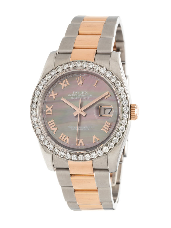 36.00 mm case diameter, later bezel containing 44 round brilliant cut diamonds, black mother-of-pearl dial, applied everose Roman numerals, center sweep seconds hand, date aperture at 3 o'clock with magnifier in crystal, self-winding movement, brushed stainless steel and everose Jubilee link bracelet, deployant clasp with Rolex logo. 7 1/2 inches inner circumference.