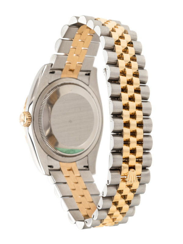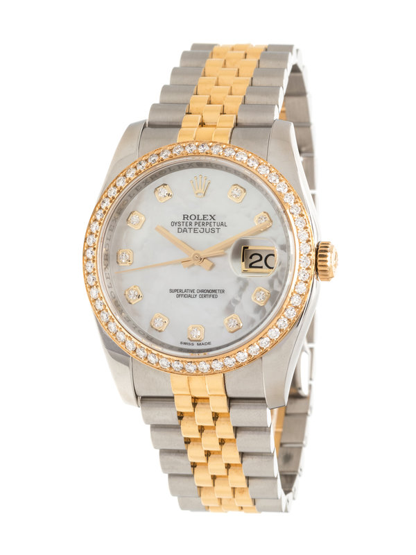 36.00 mm case diameter, bezel containing 52 round brilliant cut diamonds, dimpled mother-of-pearl dial, 10 single cut diamond numerals, center sweep seconds hand, date aperture at 3 o'clock with magnifier in crystal, self-winding movement, brushed stainless steel and yellow gold Jubilee link bracelet, deployant clasp with Rolex logo. 7 1/2 inches inner circumference.