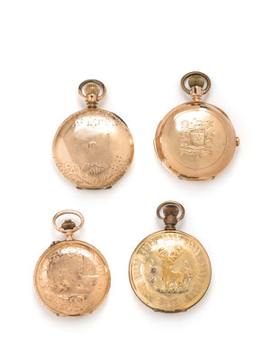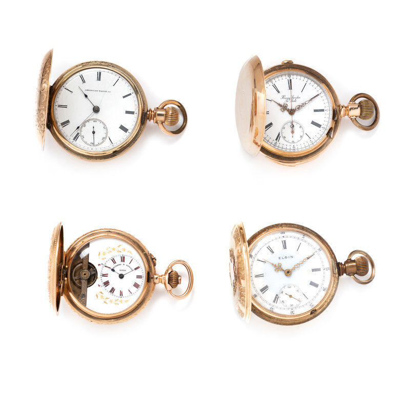 Comprising a 14K yellow gold repeater pocket watch by Henry Sandoz Locle, a 14K yellow gold pocket watch by Elgin, an 18K pocket watch by Marchand & Sandoz, together with a gold-filled pocket watch by American Watch Co.