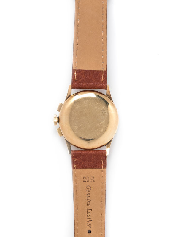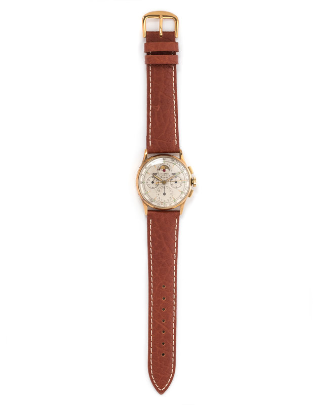 34.00 mm case diameter, matte silvered dial, applied gold baton numerals, subdial for seconds at 9 o'clock, chronograph subdials at 3 and 6 o'clock, subdial for day of the month with moon phase at 12 o'clock, central day of the week and month apertures, outer tachymeter ring, Cal. 481 17 jewel manual wind movement with chronograph function signed UNIVERSAL GENEVE.