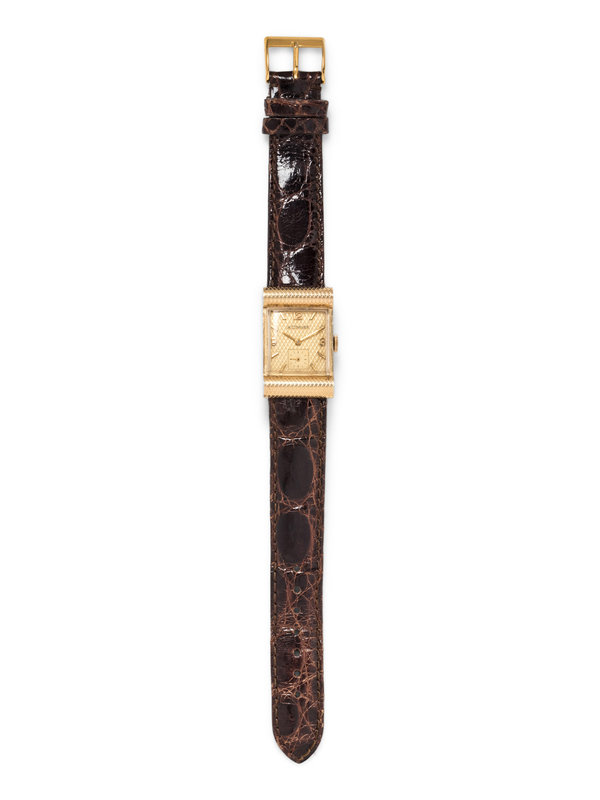 34.00 x 21.00 mm case dimensions, grid pattern gold dial and lugs, applied gold baton and Arabic numerals, subdial for seconds at 6 o'clock, 17 jewel manual wind movement signed WITTNAUER WATCH CO INC, brown crocodile strap, gold tone tang buckle. 6-7 1/4 inches long.