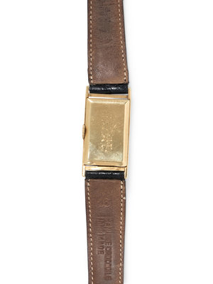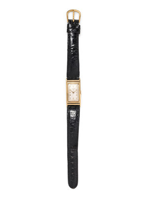 37.00 x 19.00 mm case dimensions inclusive of lugs, off white dial, applied gold Arabic numerals, 17 jewel manual wind movement signed Elgin-U.S.A., black crocodile strap, gold tone tang buckle. 6 1/2-8 inches long.
