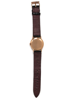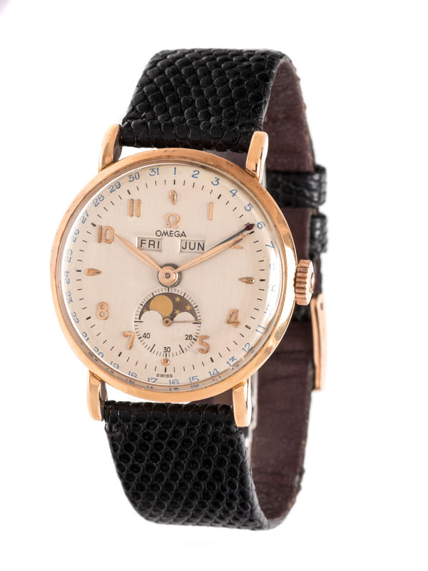 34.00 mm case diameter, matte silvered dial, applied pink gold Arabic numerals, subdial for seconds with moon phase at 6 o'clock, central day and month apertures, outer chapter ring for day of the month, 17 jewel manual wind movement signed OMEGA WATCH Co SWISS, black lizard strap, rose gold tone tang buckle with logo. 6 3/8- 8 3/8 inches long.