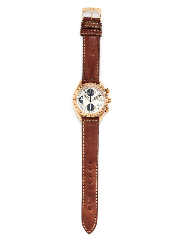38.00 mm case diameter, matte silvered dial with guilloche decoration, luminous Arabic numerals, subdials at 6, 9 and 12 o'clock with day date apertures within the 12 o'clock subdial, tachymeter bezel, Cal. 1151 25 jewel self-winding movement with chronograph function signed OMEGA, brown leather strap, gold tone tang buckle. 6 1/4-8 inches long.
