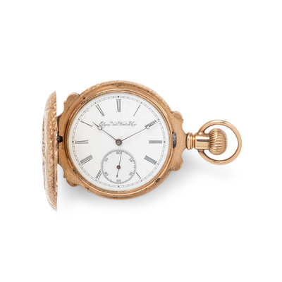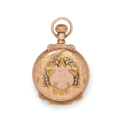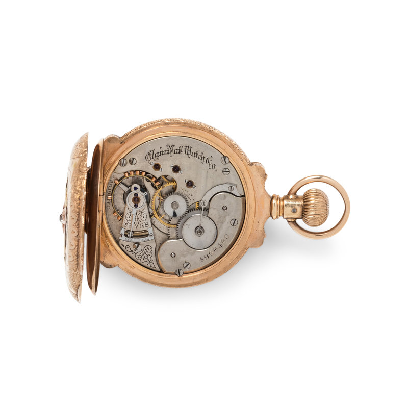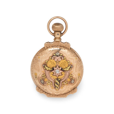49.00 mm case diameter, white dial, black Roman numerals, subdial for seconds at 6 o'clock, stem wound lever set jeweled nickel movement signed Elgin Nat'l Watch Co., engraved pink gold case with applied pink, white and yellow gold foliate motifs with monogram engraved cartouche, the reverse containing one old mine cut diamond.