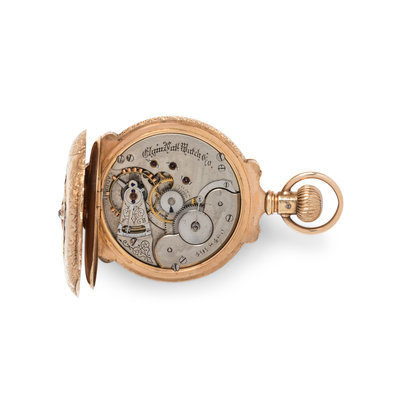 ELGIN, 14K TRICOLOR GOLD AND DIAMOND HUNTER CASE POCKET WATCH