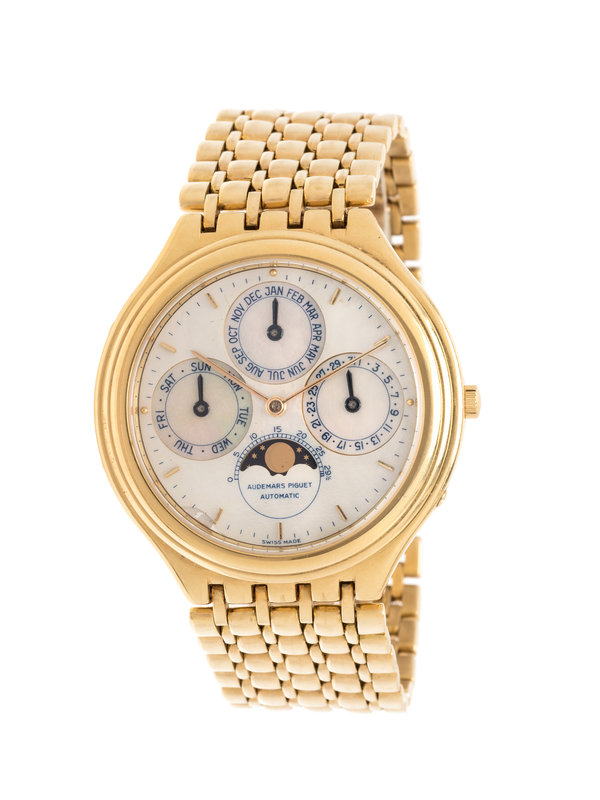 37.00 mm case diameter, mother-of-pearl dial, applied gold baton numerals, subdial at 3 o'clock for date, 6 o'clock for moon phase and leap year indication, 9 o'clock for day of the week and 12 o'clock for month, Cal. 2120/2 38 jewel self-winding movement signed AUDEMARS-PIGUET, flexible yellow gold link bracelet, double deployant clasp. 6 7/8 inches inner circumference.