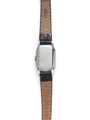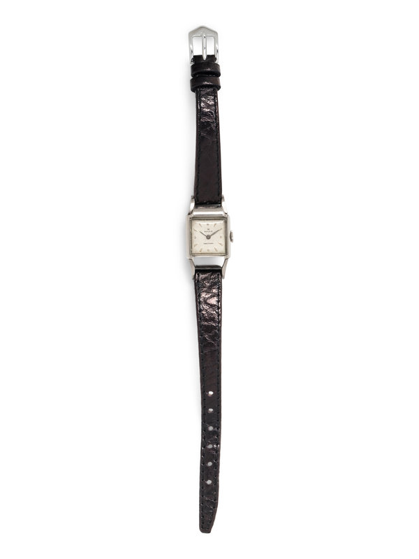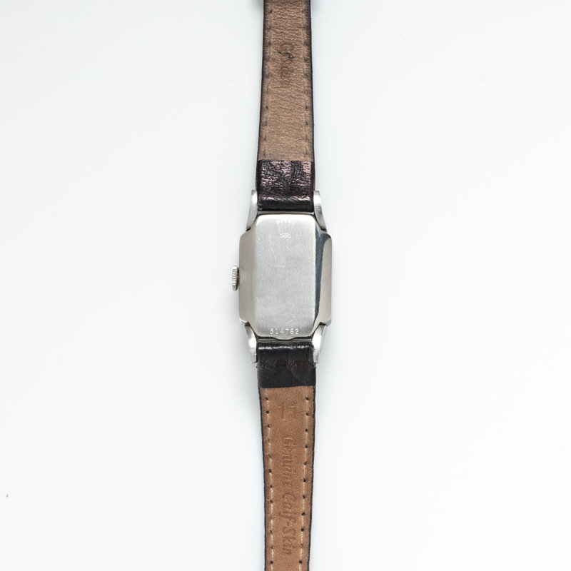 23.00 x 16.00 mm case dimensions exclusive of lugs, matte silvered dial, applied dot and triangular numerals, 17 jewel manual wind movement signed ROLEX - GENEVA, black leather strap, base metal tang buckle. 5 3/8-6 3/4 inches long.