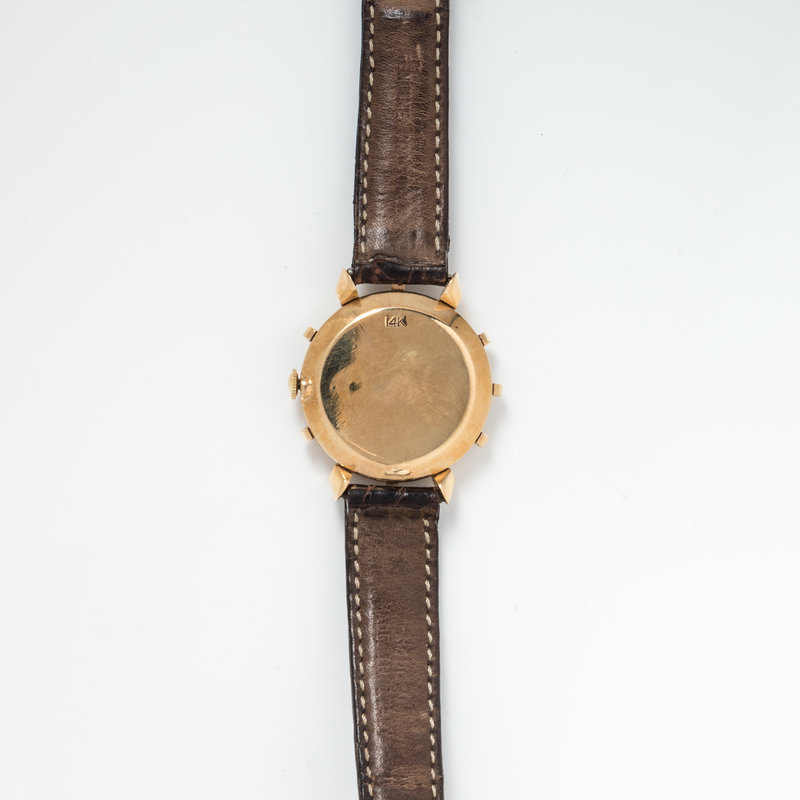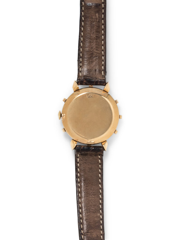 Inner case back stamp: CASED AND TIMED IN U.S.A. BY LECOULTRE 14K GOLD (maker's mark) 51186.