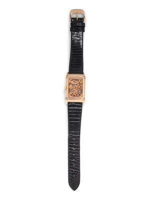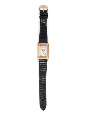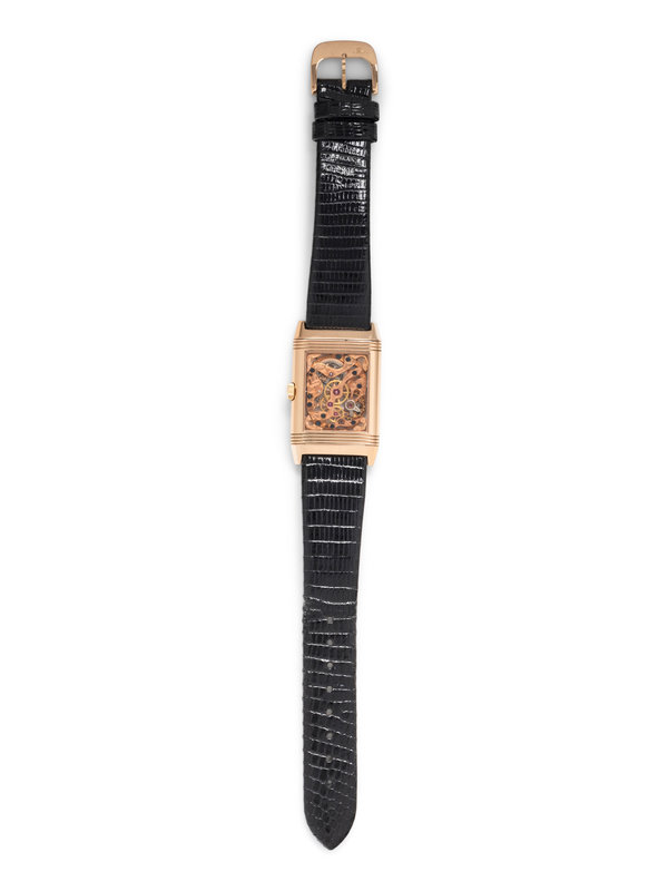 44.00 x 26.00 mm case dimensions inclusive of lugs, two-sided case mounted on a swivel hinge, the face with matte silvered dial with central guilloche engraving, applied pink gold dagger and dot numerals, subdial for seconds at 6 o'clock, the reverse with exhibition case back, manual wind 21 jewel movement signed JAEGER-LECOULTRE, black lizard strap, pink gold tang buckle with Jaeger-LeCoultre logo. 6 1/2-8 1/8 inches long.