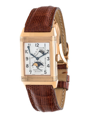 43.00 x 26.00 mm case dimensions inclusive of lugs, two-sided case mounted on a swivel hinge, the face with matte silvered dial, black Arabic numerals, subdial for seconds at 6 o'clock with moon phase, subdial at 2 o'clock with day/night indication, 40 hour power reserve subdial between 10 and 11 o'clock, the reverse with exhibition case back, 23 jewel manual wind movement signed JAEGER-LECOULTRE SWISS, brown lizard strap with yellow gold Jaeger-LeCoultre deployant clasp. 7 inches inner circumference.