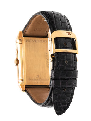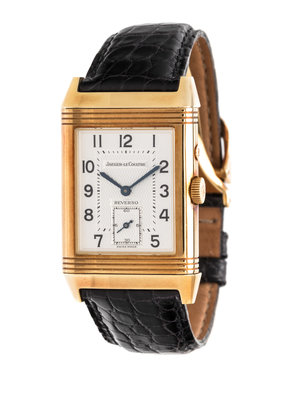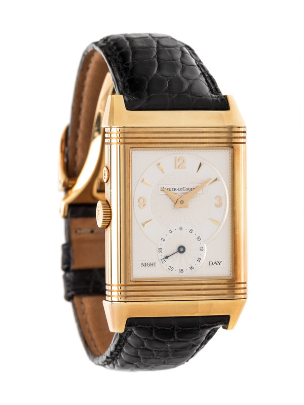 43.00 x 26.00 mm case dimensions inclusive of lugs, two-sided case mounted on a swivel hinge, the face with matte silvered dial with central guilloche engraving, black Arabic numerals, subdial for seconds at 6 o'clock, the reverse with another watch with guilloche engraved dial, applied gold Arabic and dagger numerals, subdial for seconds at 6 o'clock for date with day/night indication, manual wind movement, black crocodile strap signed JAEGER-LECOULTRE, deployant clasp with Jaeger-LeCoultre logo.