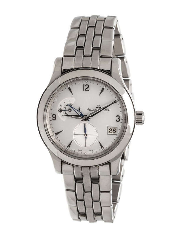 39.00 mm case diameter, matte silvered dial, date aperture at 4 o'clock, subdial for seconds at 6 o'clock, day/night indicator at 10 o'clock, exhibition case back, 29 jewel self-winding movement signed JAEGER-LECOULTRE, polished and brushed steel flexible link bracelet, double deployant clasp with Jaeger-LeCoultre logo. 7 1/2 inches inner circumference.