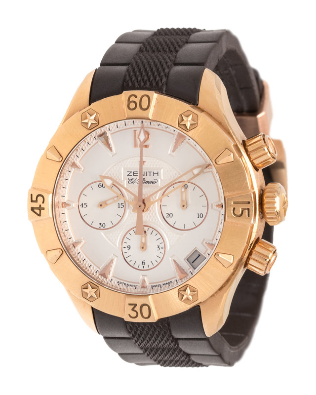 38.00 mm case diameter, matte silvered dial with guilloche engraving, applied pink gold dagger numerals, unidirectional rotating dial, date aperture between 4 and 5 o'clock, subdials for chronograph function at 3, 6 and 9 o'clock, exhibition case back, Cal. 4000SC 31 jewel self-winding movement with 22 karat gold rotor signed ZENITH, black rubber strap signed ZENITH, pink gold tang clasp. 5 1/2-7 1/2 inches inner circumference.