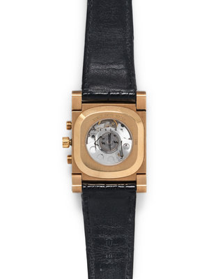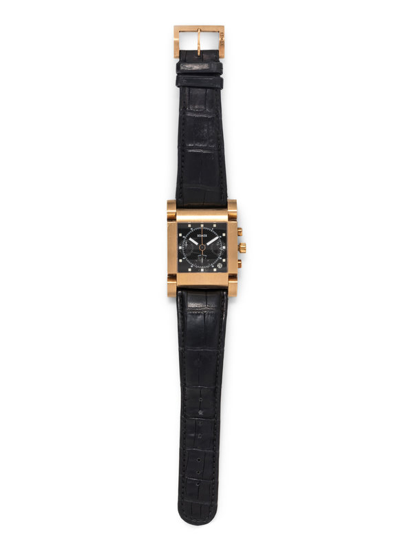 35.00 x 33.00 mm case dimensions exclusive of lugs, black dial, luminous square numerals, brushed gold case and lugs, date aperture between 4 and 5 o'clock, exhibition case back, self-winding jeweled movement with chronograph function signed XEMEX, black leather strap, yellow gold tang buckle. 6 1/2-8 inches long.