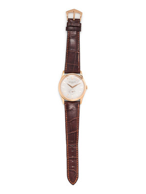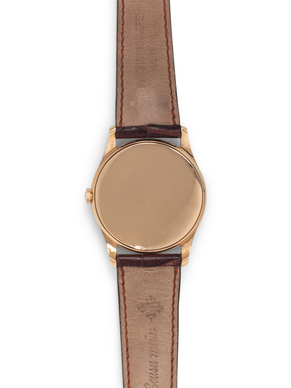 37.00 mm case diameter, matte silvered dial, applied gold baton numerals, Cal. 215 18 jewel manual wind movement signed PATEK PHILIPPE GENEVE, brown leather strap signed PATEK PHILIPPE GENEVE, gold tang buckle signed PATEK PHILIPPE. 6 1/2-7 3/4 inches long.