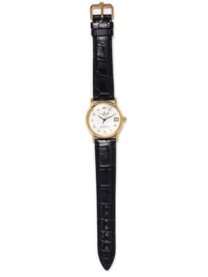 32.00 mm case diameter, white guilloche and silvered dial, applied gold Roman numerals, date aperture at 3 o'clock, self-winding movement, black leather strap signed ULYSSE NARDIN, gold tang buckle with Ulysse Nardin logo. 6 1/2-8 inches long.