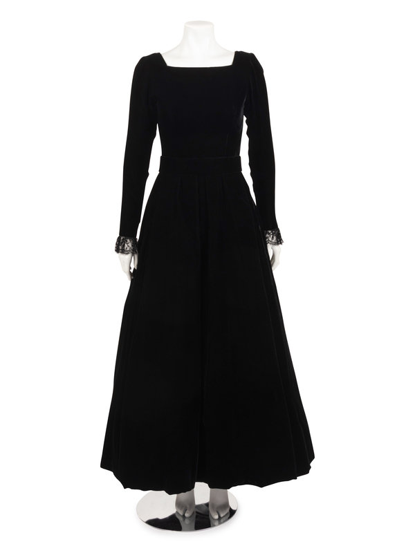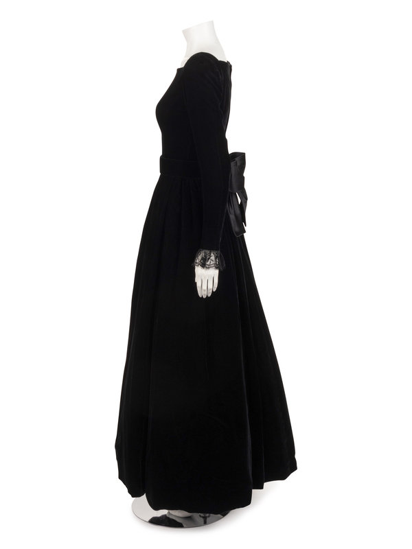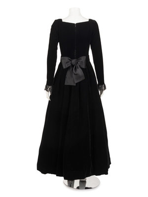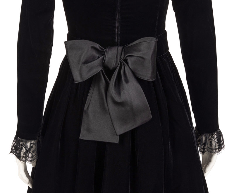 Black silk velvet dress with scoop neckline, long sleeves hemmed with black lace and a full skirt supported with a petticoat of gathered black silk taffeta that is further supported with bands of horsehair. Dress comes with a black silk velvet belt that is finished with a black silk satin bow.