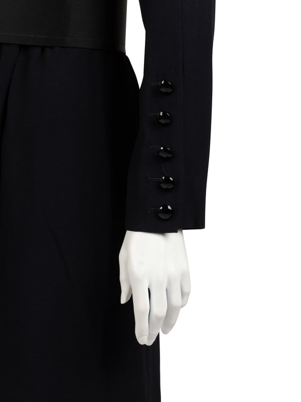 Black rayon/acetate blend crepe long sleeve wrap dress with V-neckline, buttoned sleeves, front left side closure, and wide matching belt.