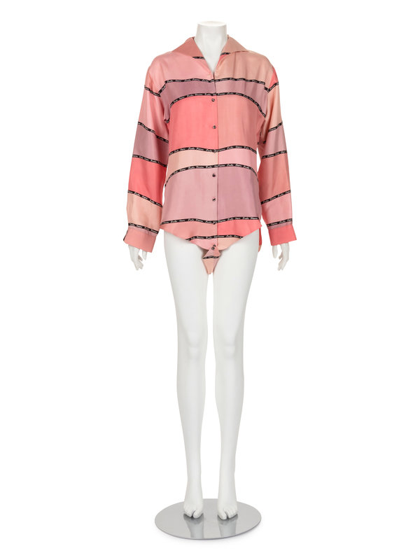Pink silk striped long sleeve bodysuit blouse with printed black stripes, pointed collar and buttoned crotch seam.