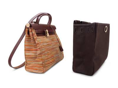 Vibrato leather Herbag in orange, yellow, and gray, trimmed in brown leather, gold-tone hardware, and front strap and lock closure. Separate brown canvas bag base creates a second bag when the leather flap is detached from the vibrato base and attached to the canvas via the long bolt at the back.