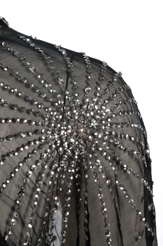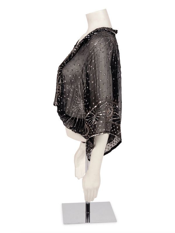 Black silk chiffon peasant top embellished with silver sequins, tie at neckline, and elasticized hem.