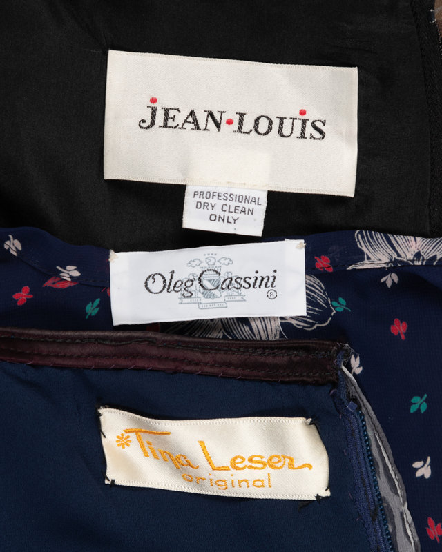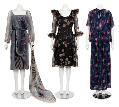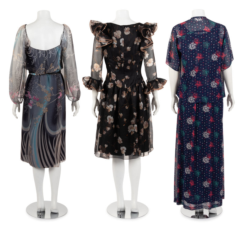 Three Floral Print Designer Dresses: One Three-Piece Oleg Cassini, One Jean-Louis, One Three-Piece Tina Leser, 1970-80s