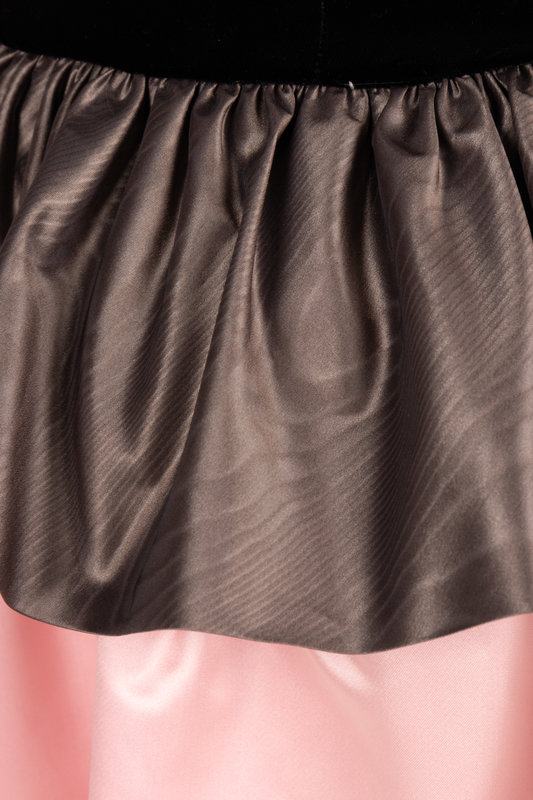 Black silk velvet strapless evening dress with gray silk moiré hip peplum, soft pink silk satin full gathered skirt, and center back zipper closure.
