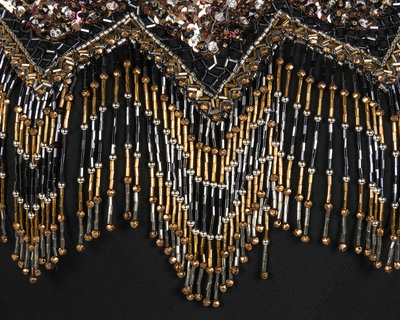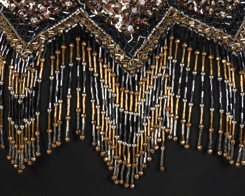 Black rayon off-shoulder long sleeve dress with gold, black and silver beading and fringe at neckline.