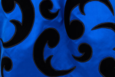 Black velvet long sleeve evening dress with royal blue taffeta gathered short skirt.