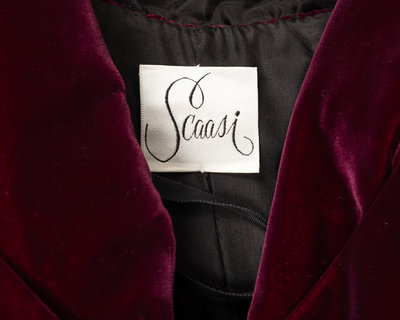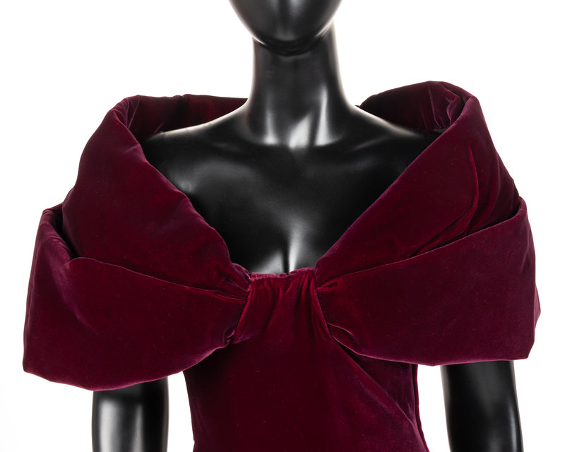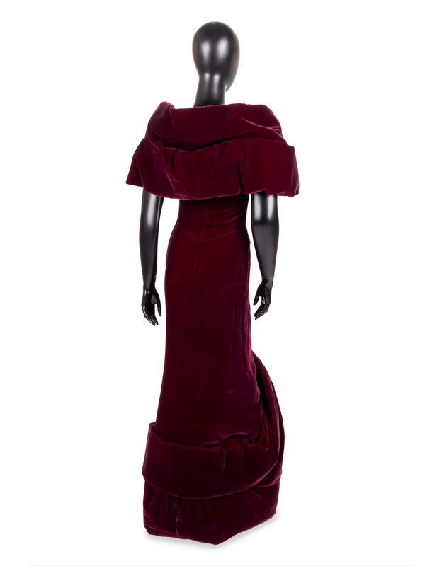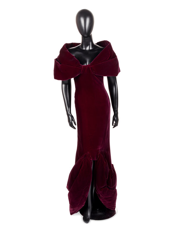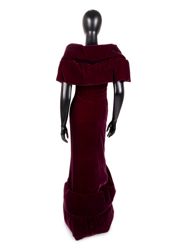 Wine silk velvet evening dress with sculpted shrug-like open neckline, sculpted draped mermaid hemline, and left side seam zipper closure.