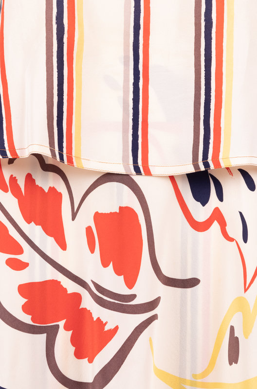 Yellow, navy grey, cream and red silk printed two-piece skirt set with striped top and leaf design on skirt.