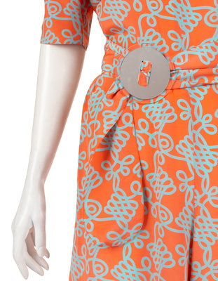 Orange and blue silk printed short sleeve jump suit with accompanying belt with mirror buckle.