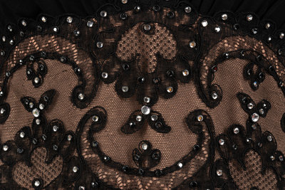 Black wool crepe long sleeve dress with deep neckline and lined mesh waistband embellished with rhinestones.