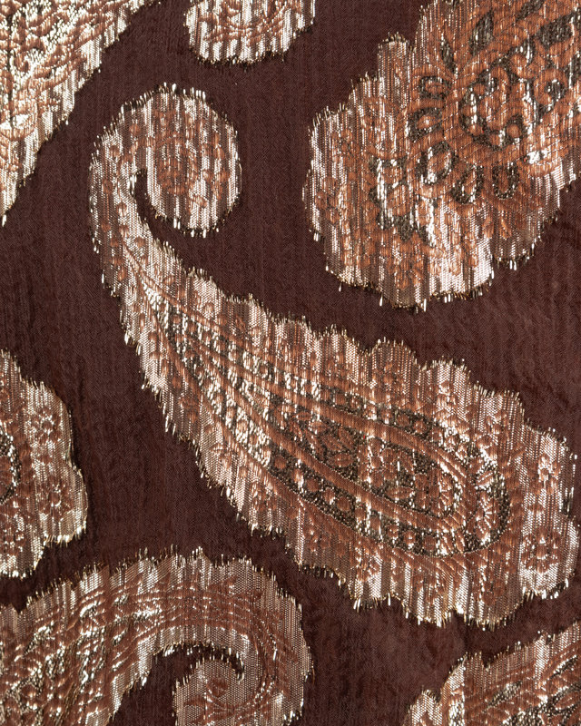 Brown and gold metallic paisley printed long sleeve dress with ruffle collar, satin bow belt at waist and flounce ruffle at hem.