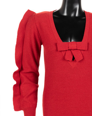 Red sweater dress with long sleeve and V-neckline with bow detail.