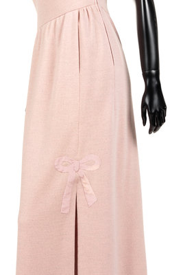 Pink cotton knit off the shoulder dress with inner bustier, two slit skirt with bow applique, and draped neckline.